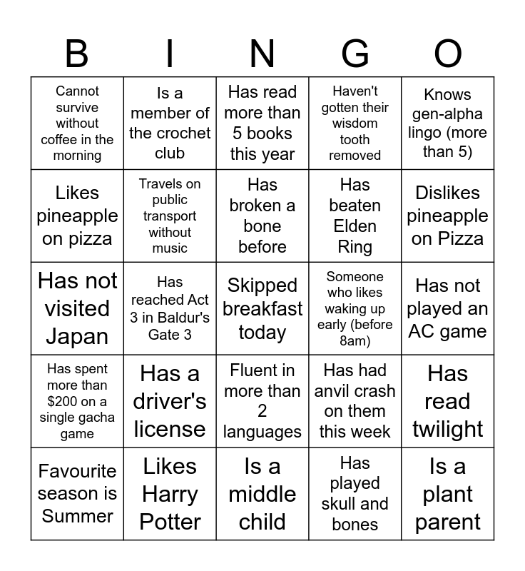 This bingo card has 25 words: Has a driver's license, Is a middle child, Has broken a bone before, Favourite season is Summer, Knows gen-alpha lingo (more than 5), Cannot survive without coffee in the morning, Likes pineapple on pizza, Is a member of the crochet club, Someone who likes waking up early (before 8am), Fluent in more than 2 languages, Has beaten Elden Ring, Has not visited Japan, Has had anvil crash on them this week, Has read twilight, Travels on public transport without music, Is a plant parent, Has not played an AC game, Has read more than 5 books this year, Dislikes pineapple on Pizza, Has reached Act 3 in Baldur's Gate 3, Skipped breakfast today, Likes Harry Potter, Has spent more than $200 on a single gacha game, Haven't gotten their wisdom tooth removed and Has played skull and bones.