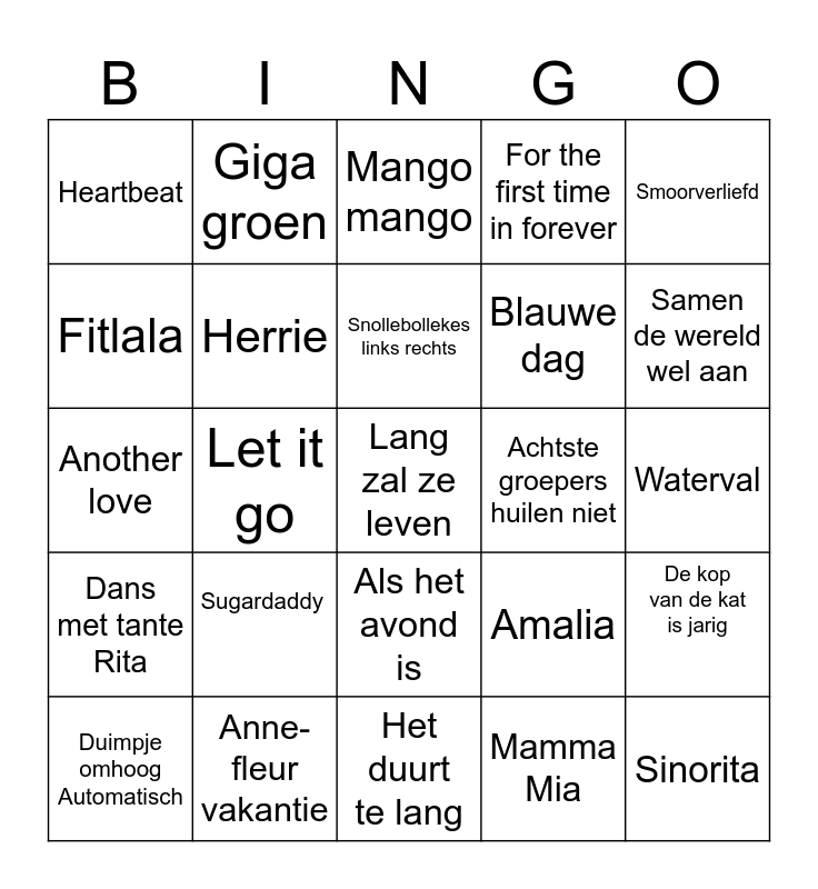 This bingo card has a free space and 24 words: Sugardaddy, Anne-fleur vakantie, Snollebollekes links rechts, Duimpje omhoog Automatisch, Smoorverliefd, Heartbeat, Fitlala, Giga groen, Achtste groepers huilen niet, Als het avond is, Blauwe dag, Another love, Amalia, De kop van de kat is jarig, Herrie, Mamma Mia, Waterval, Mango mango, Samen de wereld wel aan, Let it go, Sinorita, Dans met tante Rita, For the first time in forever and Het duurt te lang.