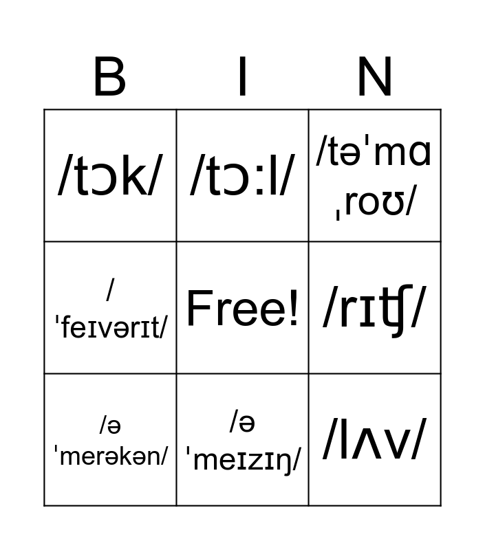 This bingo card has a free space and 13 words: /əˈmerəkən/, /mjuːˈzɪʃən/, /əˈmerəkən/, /tɔ:l/, /ˈfeɪvərɪt/, /lʌv/, /ˈæpəl/, /ɪɡˈzɑstɪd/, /əˈmeɪzɪŋ/, /tɔk/, /rɪʧ/, /təˈmɑˌroʊ/ and /ˈɔrənʤ/.