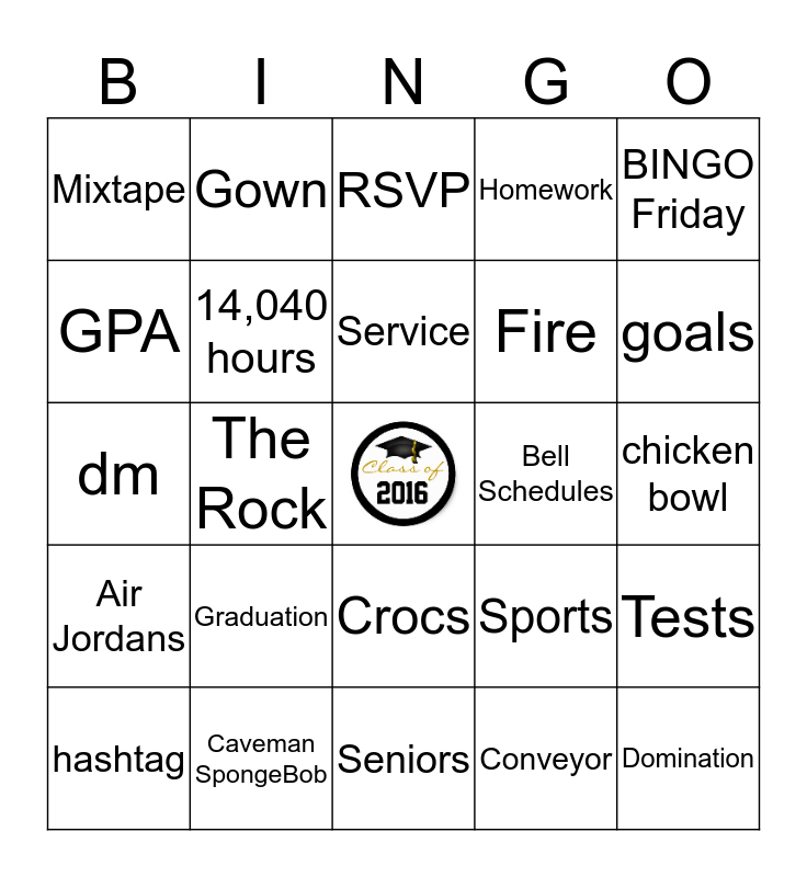 This bingo card has a free space and 48 words: Arrows, Domination, 2016, Seniors, Graduation, Cap, Gown, Diploma, GPA, AHS, 14,040 hours, Homework, Tests, Sports, Theater, Clubs, Service, Bell Schedules, Procrastination, BINGO Friday, The Rock, Conveyor, Mixtape, Fire, bae, goals, hashtag, suhhh doood, Crocs, Air Jordans, Daniel, White Vans, What are those?, dab, Caveman SpongeBob, joggers, manbun, chicken bowl, grad party, tassel, Pomp & Circumstance, Alma Mater, RSVP, heart-eye emoji, dm, OCC, neck beards and beards.