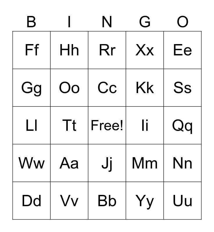 This bingo card has a free space and 25 words: Aa, Bb, Cc, Dd, Ee, Ff, Gg, Hh, Ii, Jj, Kk, Ll, Mm, Nn, Oo, Pp, Qq, Rr, Ss, Tt, Uu, Vv, Ww, Xx and Yy.