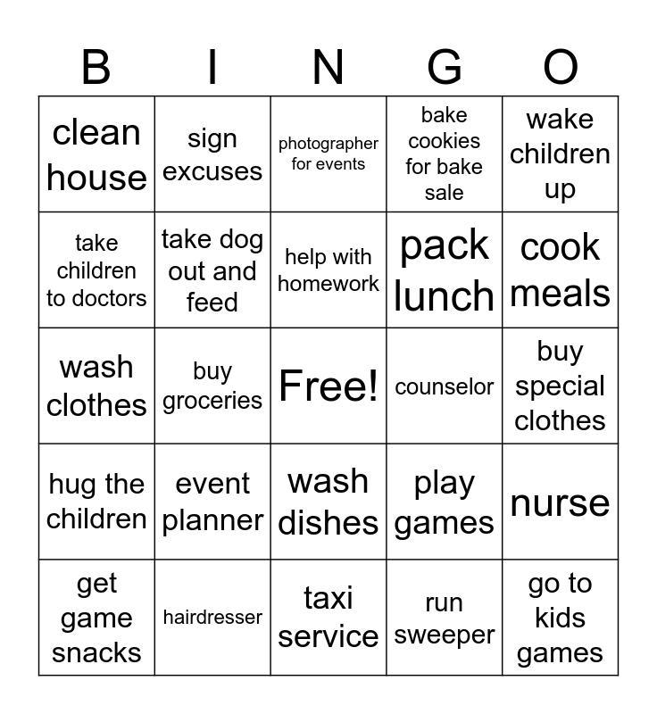 This bingo card has a free space and 24 words: event planner, hairdresser, help with homework, get game snacks, wake children up, clean house, take children to doctors, sign excuses, counselor, wash dishes, pack lunch, wash clothes, play games, nurse, take dog out and feed, run sweeper, buy special clothes, photographer for events, cook meals, buy groceries, go to kids games, hug the children, bake cookies for bake sale and taxi service.