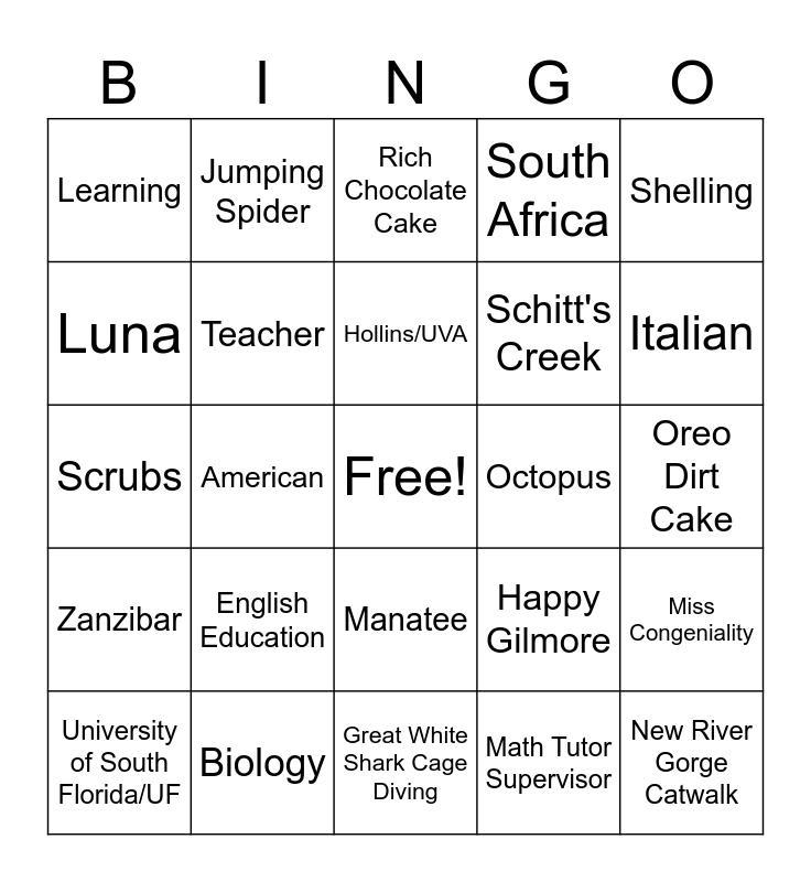 This bingo card has a free space and 24 words: English Education, Biology, Hollins/UVA, University of South Florida/UF, Shelling, Learning, Luna, Jumping Spider, Octopus, Manatee, Schitt's Creek, Scrubs, Happy Gilmore, Miss Congeniality, Teacher, Math Tutor Supervisor, Oreo Dirt Cake, Rich Chocolate Cake, Italian, American, New River Gorge Catwalk, Zanzibar, South Africa and Great White Shark Cage Diving.
