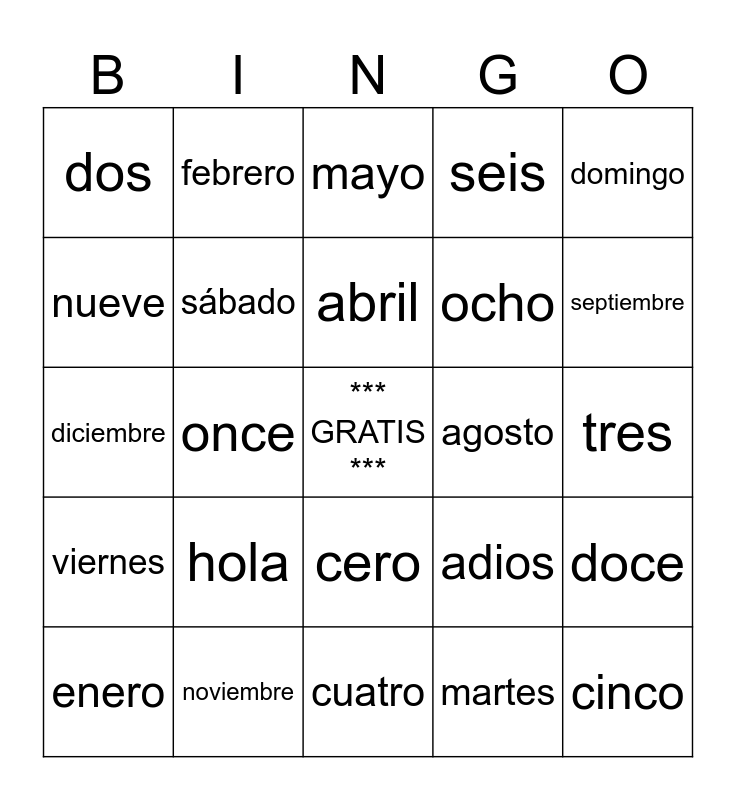 This bingo card has a free space and 34 words: lunes, martes, miércoles, jueves, viernes, sábado, domingo, enero, febrero, marzo, abril, mayo, junio, julio, agosto, septiembre, noviembre, diciembre, hola, adios, cero, uno, dos, tres, cuatro, cinco, seis, siete, ocho, nueve, diez, once, doce and trece.