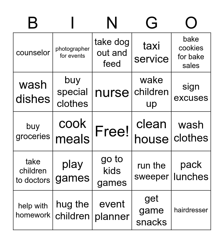 This bingo card has a free space and 24 words: play games, hug the children, nurse, help with homework, bake cookies for bake sales, counselor, wash dishes, photographer for events, clean house, go to kids games, wake children up, buy groceries, run the sweeper, pack lunches, buy special clothes, get game snacks, wash clothes, take dog out and feed, sign excuses, cook meals, hairdresser, take children to doctors, taxi service and event planner.