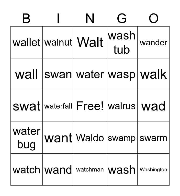 This bingo card has a free space and 24 words: want, wand, water, watch, wander, wallet, wall, walnut, walrus, Waldo, wasp, swat, swamp, swarm, swan, wash, wad, Walt, walk, waterfall, Washington, water bug, wash tub and watchman.