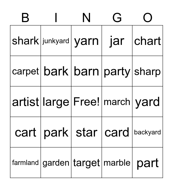 This bingo card has a free space and 36 words: arch, ark, bar, bark, card, cart, barn, charge, chart, harsh, large, jar, dark, march, sharp, shark, start, park, part, yarn, yard, backyard, garden, farmland, target, junkyard, artist, market, party, carpet, bookmark, barnyard, marble, star, sparkle and scarf.