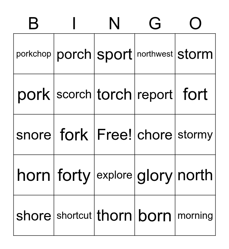 This bingo card has a free space and 32 words: born, corn, fork, form, horn, scorch, storm, north, porch, horse, torch, sport, store, score, chore, more, shore, snore, explore, forty, glory, popcorn, stormy, shortcut, morning, northwest, report, pork, porkchop, thorn, force and fort.