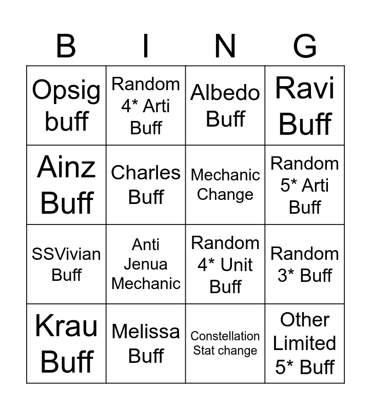 This bingo card has 16 words: Melissa Buff, Random 3* Buff, Albedo Buff, Opsig buff, SSVivian Buff, Random 4* Arti Buff, Random 4* Unit Buff, Constellation Stat change, Ainz Buff, Charles Buff, Krau Buff, Ravi Buff, Anti Jenua Mechanic, Random 5* Arti Buff, Mechanic Change and Other Limited 5* Buff.