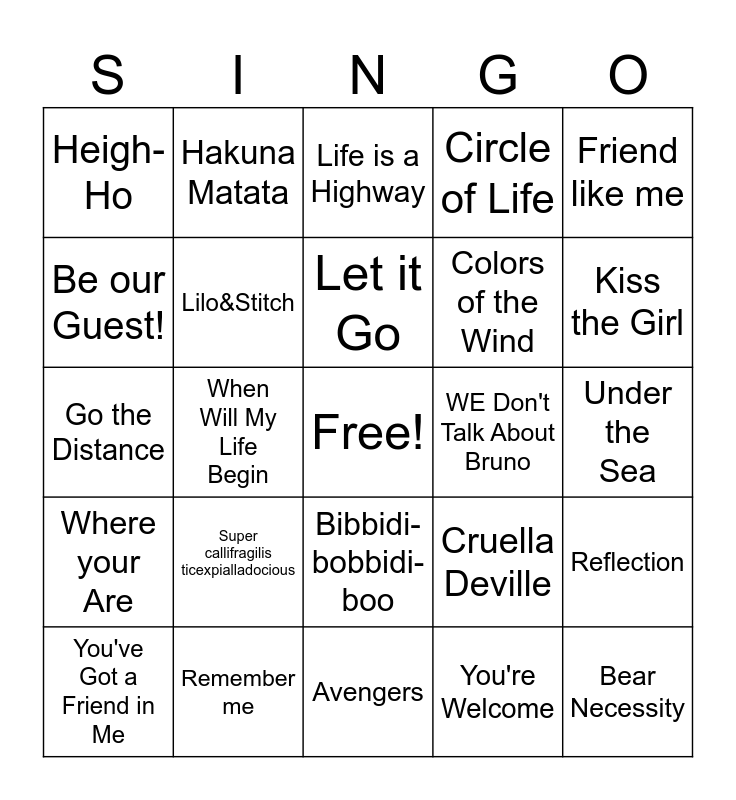 This bingo card has a free space and 26 words: Bibbidi-bobbidi-boo, You're Welcome, Let it Go, Remember me, Friend like me, Heigh-Ho, Be our Guest!, Hakuna Matata, Under the Sea, Cruella Deville, Colors of the Wind, Go the Distance, Reflection, You've Got a Friend in Me, When Will My Life Begin, Stars Wars Theme, Circle of Life, Where your Are, Life is a Highway, Bear Necessity, Kiss the Girl, Avengers, WE Don't Talk About Bruno, Super callifragilis ticexpialladocious, Lilo&Stitch and When You Wish Upon a Star.