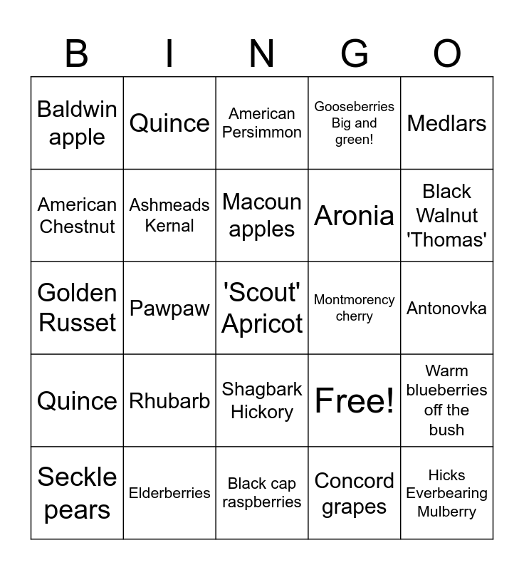 This bingo card has 25 words: Rhubarb, Black cap raspberries, Macoun apples, Seckle pears, Medlars, Baldwin apple, American Chestnut, Quince, Montmorency cherry, Shagbark Hickory, Aronia, Golden Russet, Free!, Warm blueberries off the bush, Ashmeads Kernal, Hicks Everbearing Mulberry, Antonovka, American Persimmon, Black Walnut 'Thomas', Pawpaw, 'Scout' Apricot, Elderberries, Quince, Gooseberries Big and green! and Concord grapes.