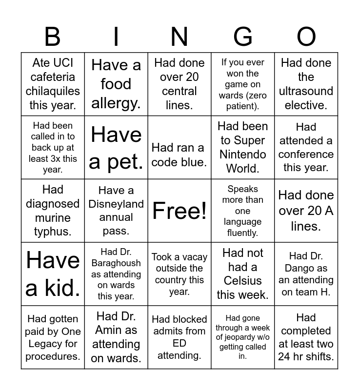 This bingo card has a free space and 24 words: Had Dr. Baraghoush as attending on wards this year., Had Dr. Amin as attending on wards., Had ran a code blue., Had gotten paid by One Legacy for procedures., Had done the ultrasound elective., Ate UCI cafeteria chilaquiles this year., Had been called in to back up at least 3x this year., Have a food allergy., Speaks more than one language fluently., Took a vacay outside the country this year., Had been to Super Nintendo World., Had diagnosed murine typhus., Had not had a Celsius this week., Had Dr. Dango as an attending on team H., Have a pet., Had gone through a week of jeopardy w/o getting called in., Had done over 20 A lines., Had done over 20 central lines., Had attended a conference this year., Have a Disneyland annual pass., Had completed at least two 24 hr shifts., Have a kid., If you ever won the game on wards (zero patient). and Had blocked admits from ED attending..