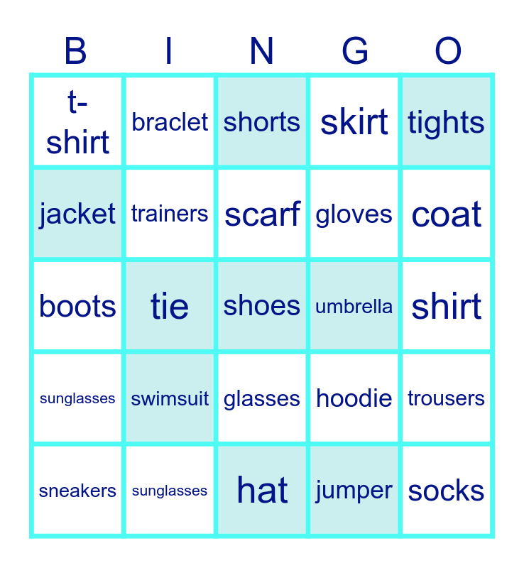 This bingo card has a free space and 24 words: swimsuit, sunglasses, scarf, sneakers, tights, t-shirt, jacket, braclet, umbrella, glasses, gloves, boots, hoodie, trousers, trainers, jumper, shirt, shorts, coat, tie, socks, sunglasses, skirt and hat.