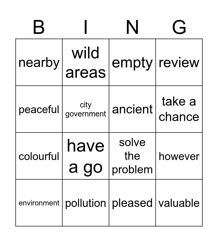 This bingo card has 16 words: pollution, however, empty, nearby, colourful, wild areas, solve the problem, pleased, peaceful, city government, environment, review, have a go, take a chance, ancient and valuable.