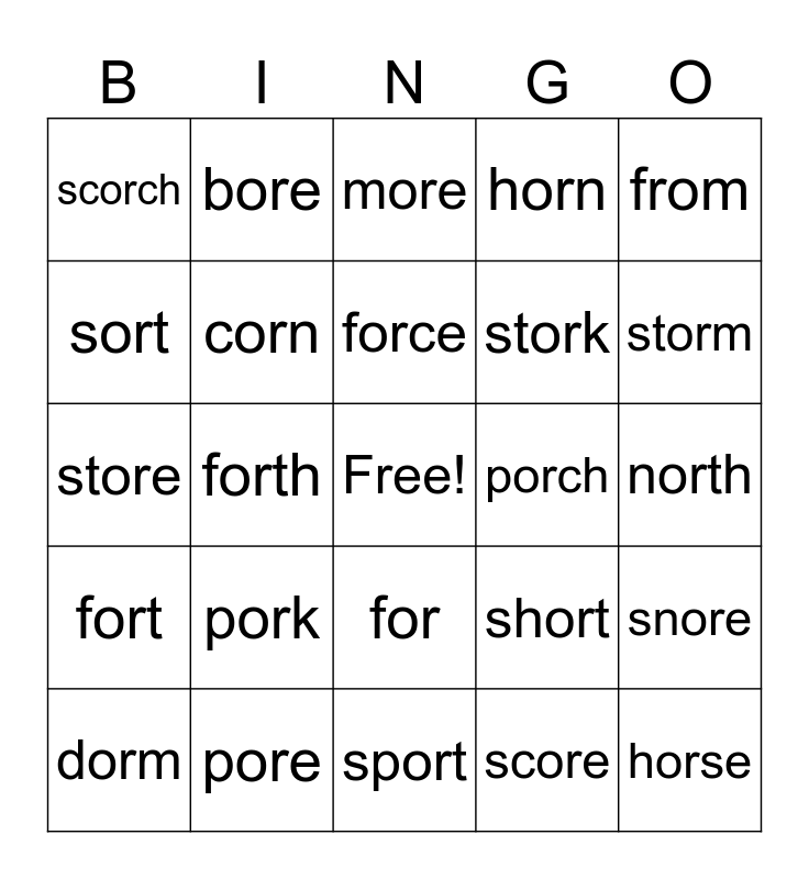 This bingo card has a free space and 39 words: born, cord, cork, corn, dorm, for, force, fork, from, fort, forth, horn, horse, north, porch, pork, port, scorch, scorn, short, sort, sport, stork, storm, sworn, thorn, torch, torn, worn, bore, chore, core, more, pore, score, shore, snore, store and tore.