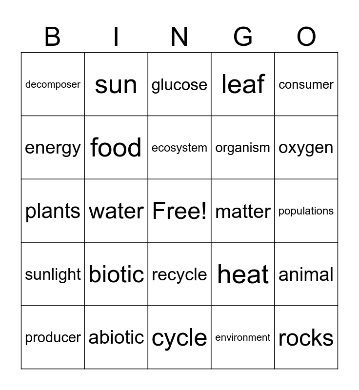 This bingo card has a free space and 24 words: biotic, abiotic, ecosystem, producer, consumer, decomposer, energy, sun, matter, recycle, organism, plants, heat, animal, food, environment, populations, glucose, oxygen, water, rocks, sunlight, leaf and cycle.