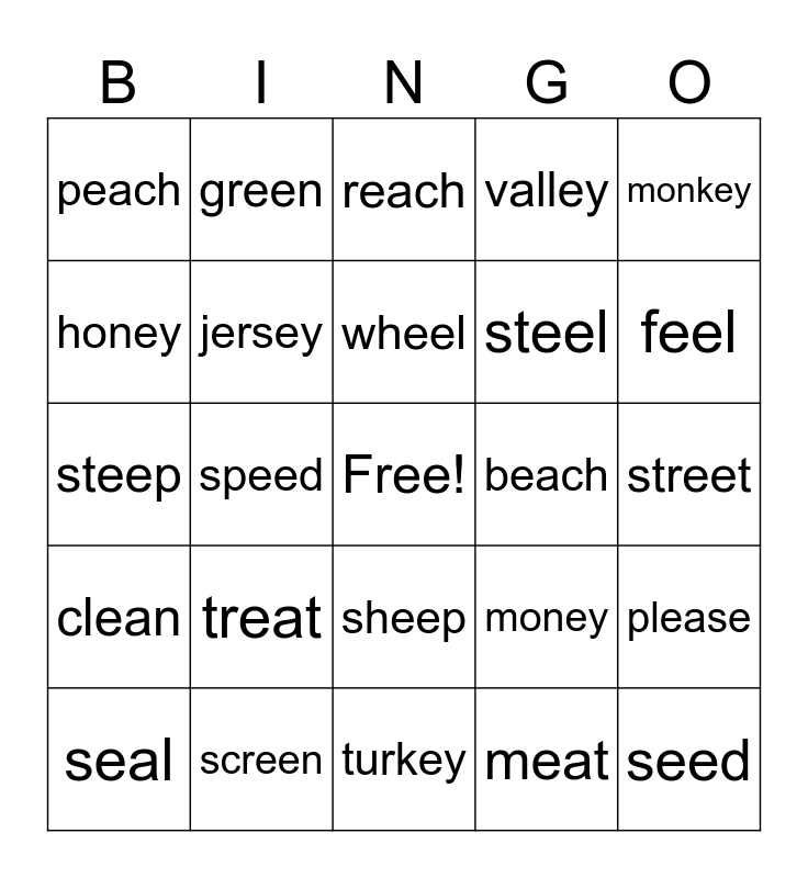 This bingo card has a free space and 24 words: treat, screen, wheel, seal, monkey, peach, honey, green, beach, sheep, steel, steep, money, please, jersey, meat, street, reach, feel, speed, seed, clean, valley and turkey.