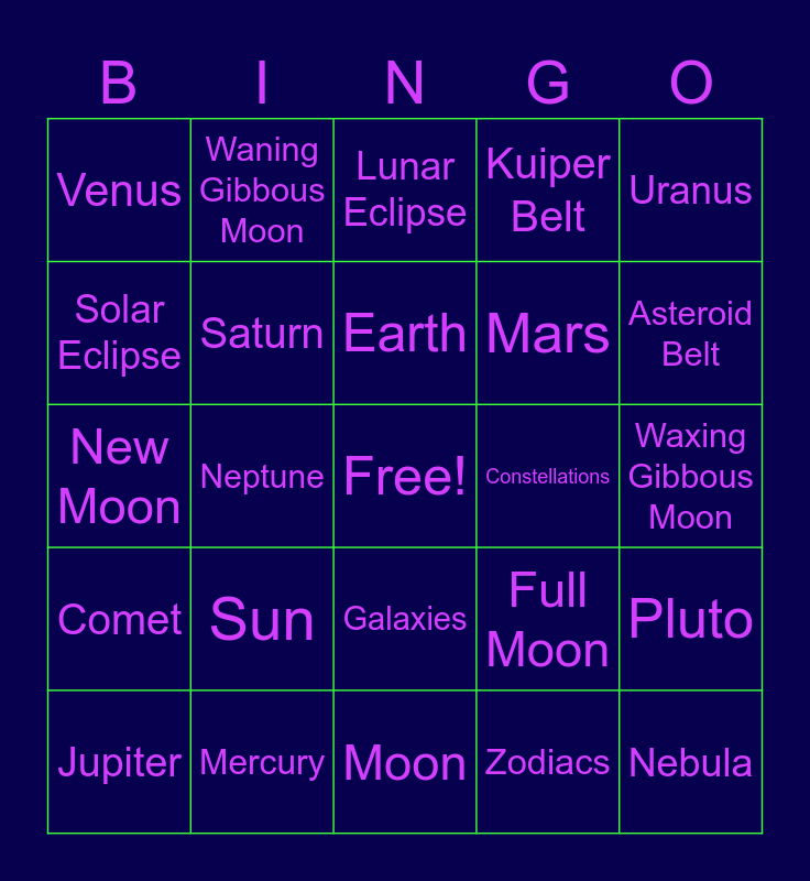 This bingo card has a free space and 24 words: Sun, Mercury, Earth, Jupiter, Uranus, Venus, Solar Eclipse, Waning Gibbous Moon, Constellations, Galaxies, Mars, New Moon, Full Moon, Pluto, Saturn, Zodiacs, Waxing Gibbous Moon, Lunar Eclipse, Asteroid Belt, Neptune, Nebula, Comet, Kuiper Belt and Moon.