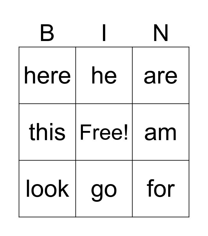 This bingo card has a free space and 22 words: I, the, he, she, am, look, here, are, come, down, going, this, is, me, we, looking, at, my, said, for, go and to.