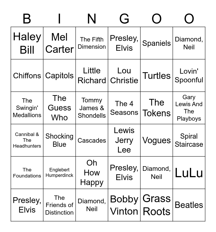 ⚠ This card has duplicate items: Beatles (4), The Foundations (2), Diamond, Neil (3), Presley, Elvis (3), Grass Roots (2)