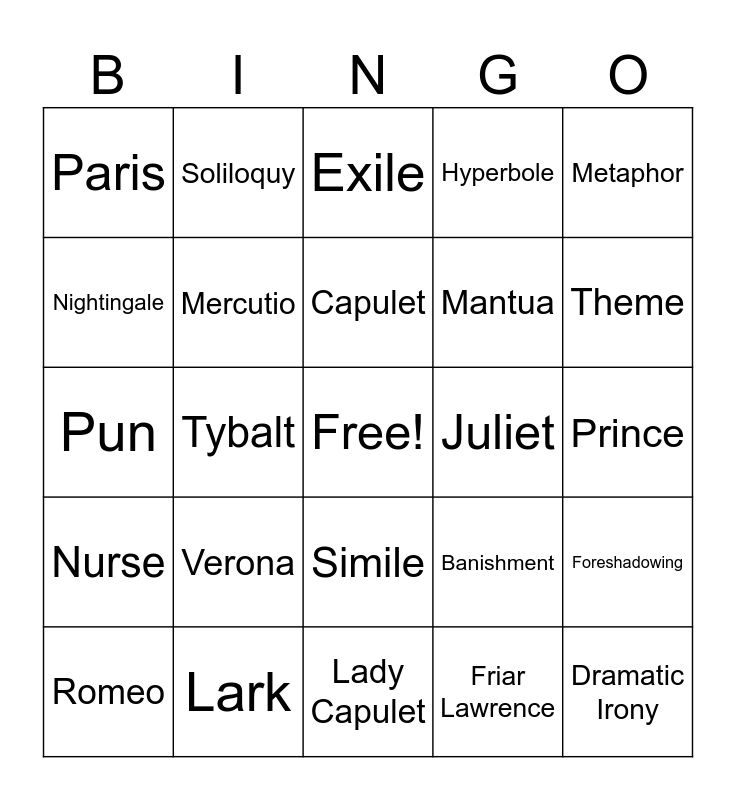 This bingo card has a free space and 24 words: Verona, Lark, Capulet, Romeo, Metaphor, Paris, Nightingale, Soliloquy, Juliet, Simile, Mantua, Pun, Banishment, Foreshadowing, Mercutio, Friar Lawrence, Prince, Exile, Theme, Tybalt, Dramatic Irony, Nurse, Hyperbole and Lady Capulet.
