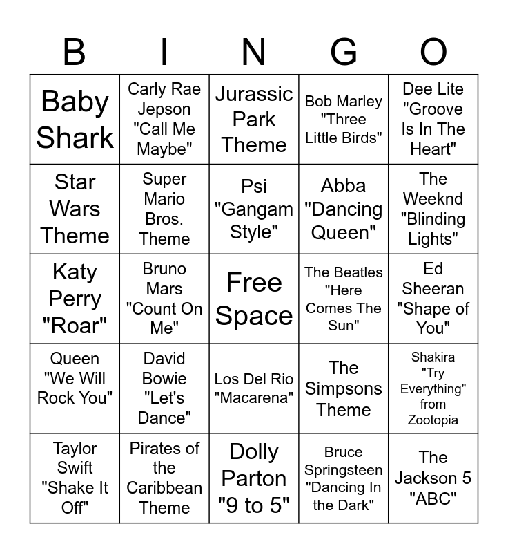 This bingo card has a free space and 24 words: David Bowie "Let's Dance", Pirates of the Caribbean Theme, Psi "Gangam Style", Taylor Swift "Shake It Off", Dee Lite "Groove Is In The Heart", Baby Shark, Star Wars Theme, Carly Rae Jepson "Call Me Maybe", The Beatles "Here Comes The Sun", Los Del Rio "Macarena", Abba "Dancing Queen", Katy Perry "Roar", The Simpsons Theme, Shakira "Try Everything" from Zootopia, Super Mario Bros. Theme, Bruce Springsteen "Dancing In the Dark", Ed Sheeran "Shape of You", Jurassic Park Theme, The Weeknd "Blinding Lights", Bruno Mars "Count On Me", The Jackson 5 "ABC", Queen "We Will Rock You", Bob Marley "Three Little Birds" and Dolly Parton "9 to 5".