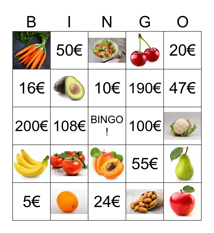 This bingo card has 12 images, a free space and 12 words: 5€, 10€, 20€, 50€, 100€, 200€, 55€, 16€, 24€, 47€, 108€ and 190€.