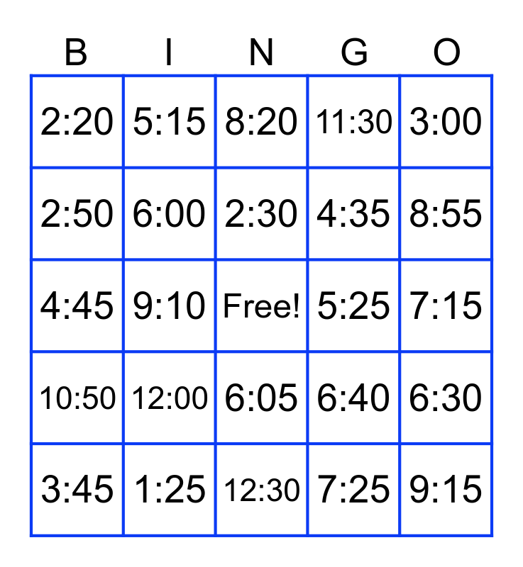 This bingo card has a free space and 24 words: 12:00, 1:25, 2:30, 3:45, 3:00, 2:20, 2:50, 5:15, 5:25, 6:05, 4:35, 4:45, 6:40, 6:30, 6:00, 7:25, 7:15, 8:20, 8:55, 9:10, 9:15, 10:50, 11:30 and 12:30.