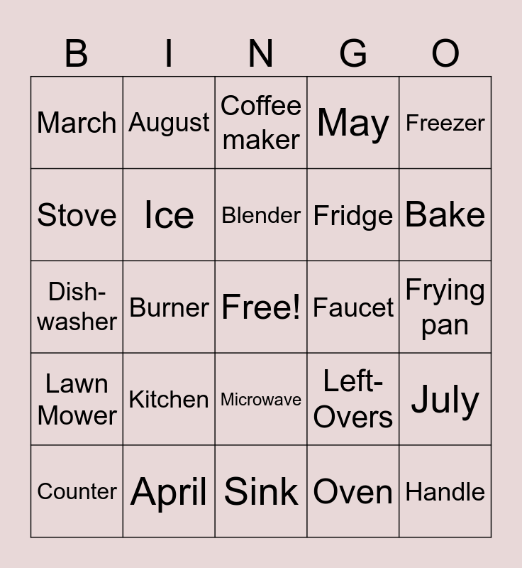 This bingo card has a free space and 24 words: Kitchen, April, Blender, Counter, Freezer, March, Stove, August, Faucet, Microwave, Fridge, Dish-washer, Left-Overs, July, Ice, Oven, Frying pan, Coffee maker, Bake, Burner, Handle, Lawn Mower, May and Sink.
