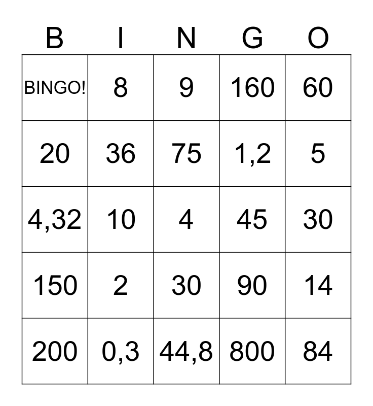 This bingo card has a free space and 24 words: 2, 0,3, 75, 200, 60, BINGO!, 20, 8, 45, 30, 1,2, 4,32, 90, 14, 36, 800, 30, 9, 5, 10, 84, 150, 160 and 44,8.