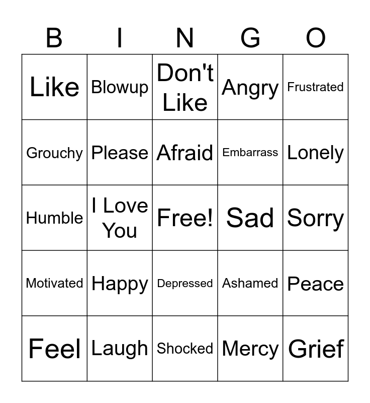 This bingo card has a free space and 29 words: Feel, Emotion, I Love You, Hate, Like, Don't Like, Please, Happy, Sad, Laugh, Sorry, Grief, Shocked, Mercy, Lonely, Inspired, Depressed, Motivated, Frustrated, Humble, Ashamed, Flirt, Embarrass, Grouchy, Angry, Blowup, Peace, Afraid and Fear.