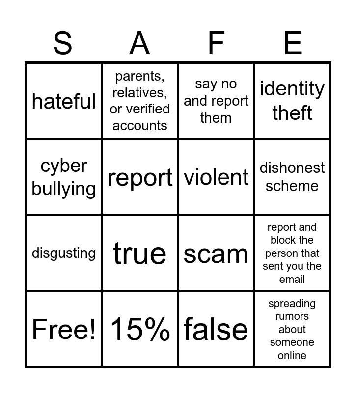 This bingo card has 16 words: 15%, report and block the person that sent you the email, say no and report them, hateful, disgusting, parents, relatives, or verified accounts, scam, false, cyber bullying, report, Free!, identity theft, true, dishonest scheme, violent and spreading rumors about someone online.