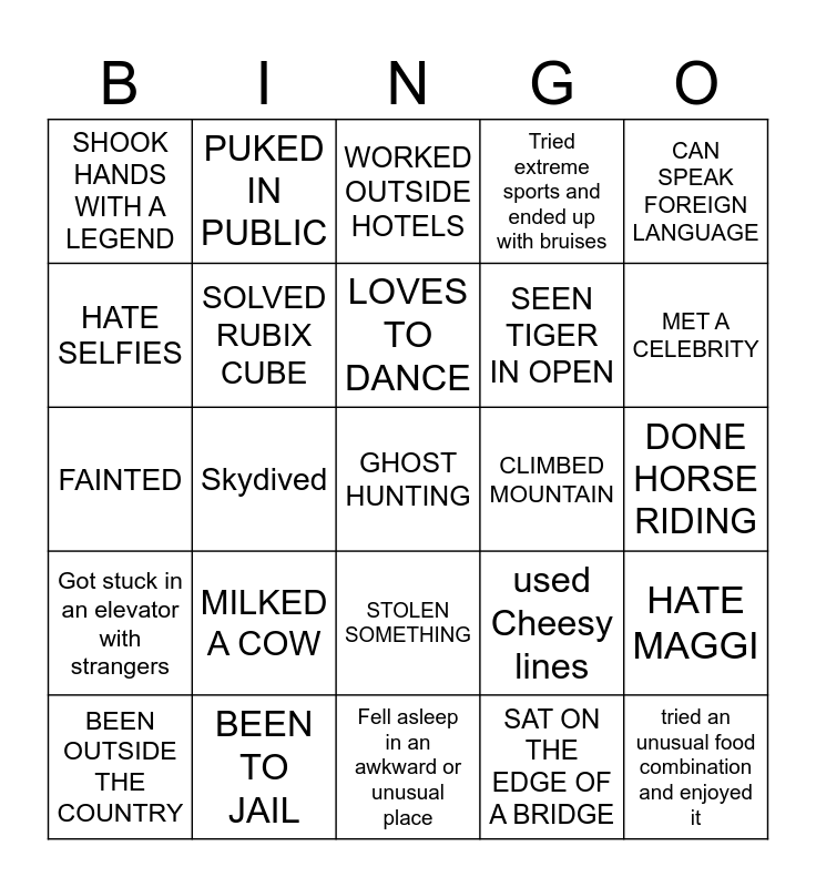 This bingo card has a free space and 24 words: MILKED A COW, BEEN TO JAIL, LOVES TO DANCE, BEEN OUTSIDE THE COUNTRY, CAN SPEAK FOREIGN LANGUAGE, SHOOK HANDS WITH A LEGEND, HATE SELFIES, PUKED IN PUBLIC, CLIMBED MOUNTAIN, STOLEN SOMETHING, SEEN TIGER IN OPEN, FAINTED, used Cheesy lines, HATE MAGGI, SOLVED RUBIX CUBE, SAT ON THE EDGE OF A BRIDGE, DONE HORSE RIDING, WORKED OUTSIDE HOTELS, MET A CELEBRITY, Skydived, tried an unusual food combination and enjoyed it, Got stuck in an elevator with strangers, Tried extreme sports and ended up with bruises and Fell asleep in an awkward or unusual place.