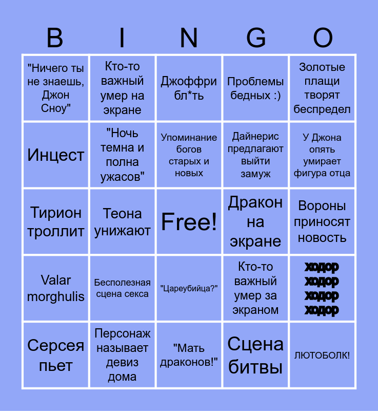 This bingo card has a free space and 24 words: Бесполезная сцена секса, Персонаж называет девиз дома, Упоминание богов старых и новых, Серсея пьет, Золотые плащи творят беспредел, "Ничего ты не знаешь, Джон Сноу", Инцест, Кто-то важный умер на экране, Дракон на экране, "Цареубийца?", Дайнерис предлагают выйти замуж, Тирион троллит, Кто-то важный умер за экраном, ходор ходор ходор ходор, "Ночь темна и полна ужасов", Сцена битвы, Вороны приносят новость, Джоффри бл*ть, У Джона опять умирает фигура отца, Теона унижают, ЛЮТОБОЛК!, Valar morghulis, Проблемы бедных :) and "Мать драконов!".