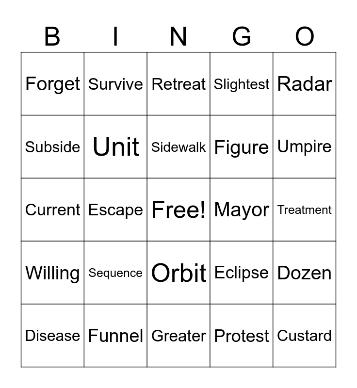 This bingo card has a free space and 24 words: Sequence, Funnel, Sidewalk, Disease, Radar, Forget, Subside, Survive, Mayor, Orbit, Figure, Current, Eclipse, Dozen, Unit, Protest, Treatment, Retreat, Umpire, Escape, Custard, Willing, Slightest and Greater.