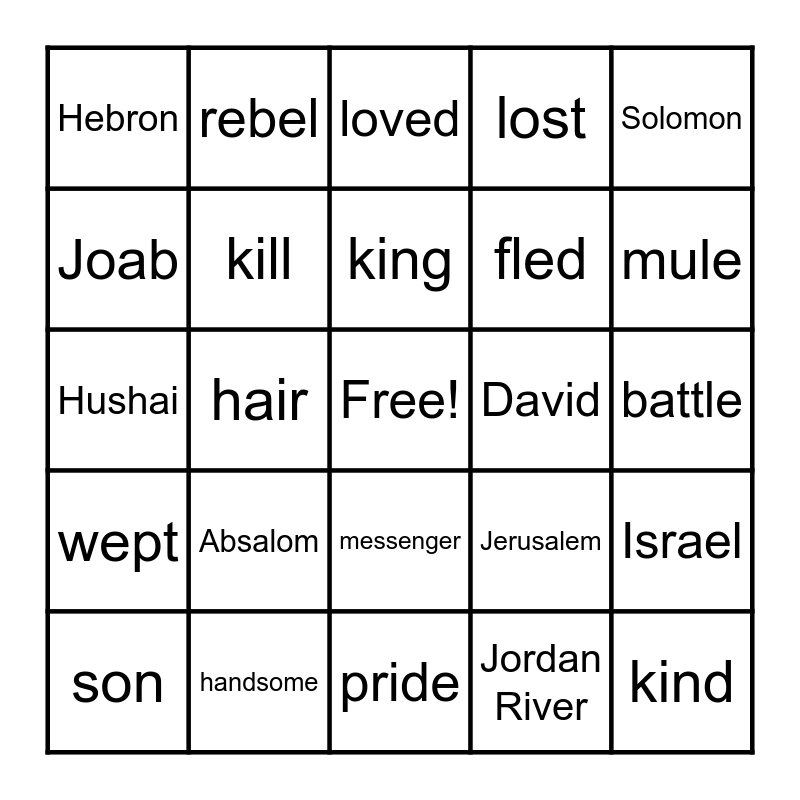 This bingo card has a free space and 24 words: Absalom, handsome, king, son, Solomon, Hebron, Joab, rebel, David, messenger, fled, Hushai, Jerusalem, Israel, kill, Jordan River, battle, loved, mule, hair, kind, wept, lost and pride.
