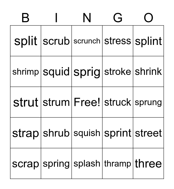This bingo card has a free space and 29 words: scrap, splot, strum, strip, split, scrunch, squid, shrub, struck, spring, sprung, three, splash, thramp, shrink, shred, squish, strap, splint, strut, sprint, thrust, stroke, shrimp, stress, scrub, street, sprig and strand.