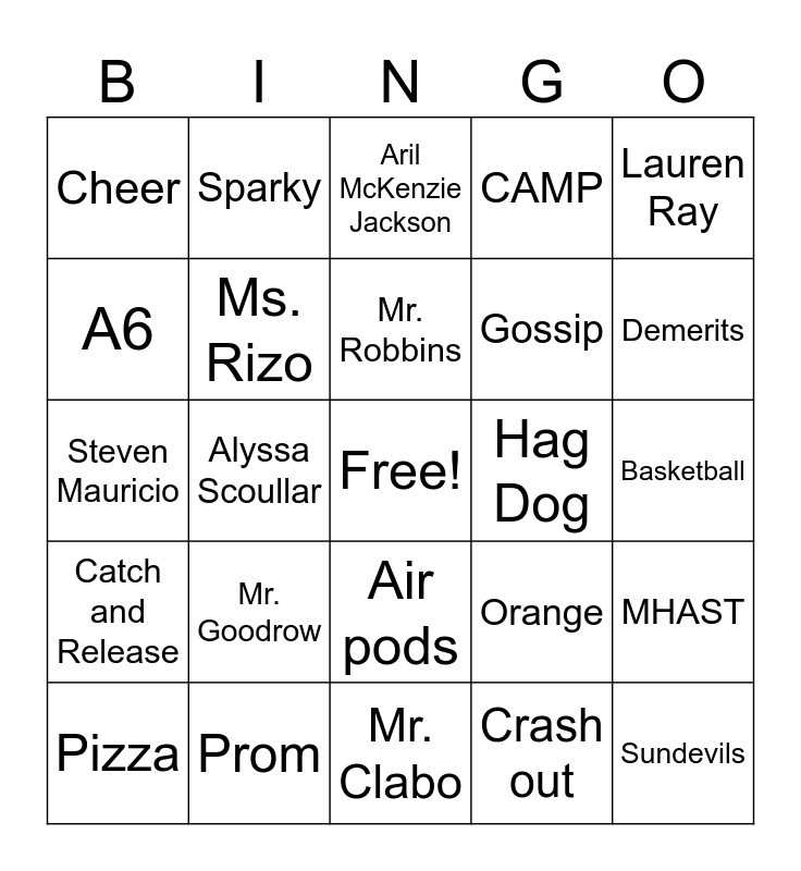 This bingo card has a free space and 49 words: Trident, Sundevils, Football, Mr. Clabo, Mr. Goodrow, Sundevil Circle, Sparky, Library, A6, A3, Ms. Rizo, CAMP, MHAST, Orange, 1967, Mrs. Robbins, Mr. Robbins, Hag Dog, Chloe Zirbes, Lauren Ray, Alyssa Scoullar, Crash out, Cheer, Gossip, Pride, Demerits, Pizza, Orange Chicken, Air pods, Catch and Release, Tardy Sweep, Put it away ALL the way, SPARK, Camera, Prom, Graduation, Baseball, Softball, Basketball, Golf, Swim, High Desert, 2Fly, Hood Trophies, Steven Mauricio, Aril McKenzie Jackson, C39, Contagious and Chain.