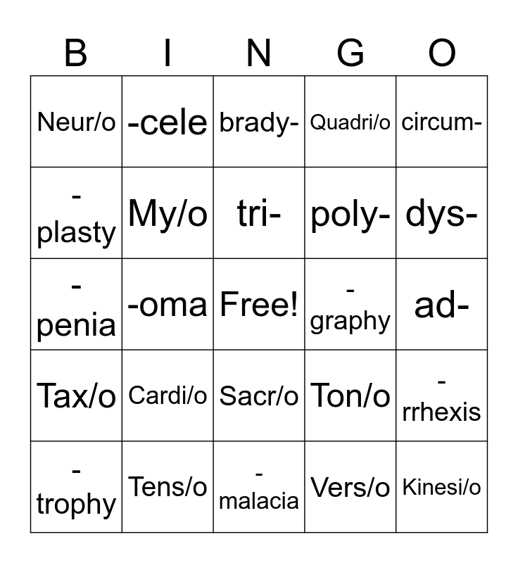 This bingo card has a free space and 24 words: Cardi/o, Tens/o, tri-, -trophy, circum-, Neur/o, -plasty, -cele, -graphy, Sacr/o, poly-, -penia, Ton/o, -rrhexis, My/o, Vers/o, ad-, brady-, dys-, -oma, Kinesi/o, Tax/o, Quadri/o and -malacia.