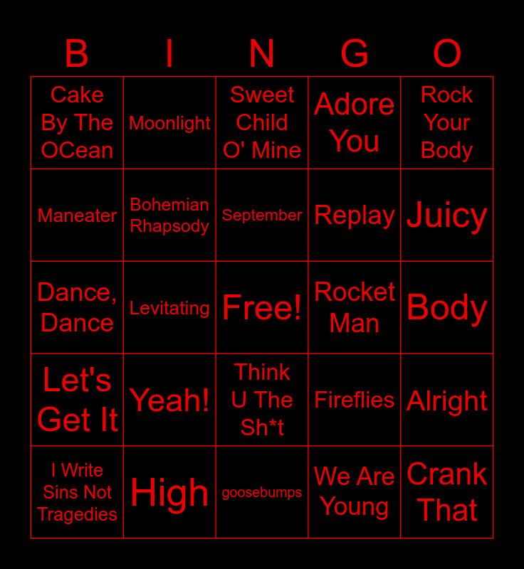 This bingo card has a free space and 50 words: 24K Magic, Crank That, SICKO MODE, goosebumps, Yeah!, Starboy, Moonlight, One More Time, Maneater, Hey Ya!, Bohemian Rhapsody, Adore You, Alright, Fireflies, I Say a Little Prayer, Sugar, September, Rocket Man, Africa, Rock Your Body, Levitating, We Are Young, Cake By The OCean, Replay, Pompeii, In Da Club, Juicy, Love, Sweet Child O' Mine, Think U The Sh*t, Oh Okay, f*kumean, Way. Sexy, Bad Bad Bad, High, With That, Wanna Be, WAP, Thot Sh*t, Body, Religiously, Rock and A Hard Place, BLACKBIRD, Bigger Than The Song, I Write Sins Not Tragedies, Dance, Dance, Lovers And Friends, Your Friends, Let's Get It and Snooze.