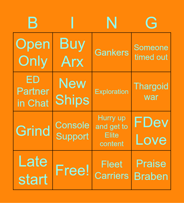 This bingo card has 28 words: Ship Interiors, Powerplay, Grind, SCO FSD, New Ships, Gankers, Buy Arx, Praise Braben, Free!, Pay2Win, Hurry up and get to Elite content, Someone timed out, Someone banned, Message deleted by mods, Console Support, Drops, o7, Exploration, Thargoid war, !Wrong giveaway message, Open Only, FDev Hate, Late start, FDev Love, Fleet Carriers, Bugs, ED Partner in Chat and Non English chat.