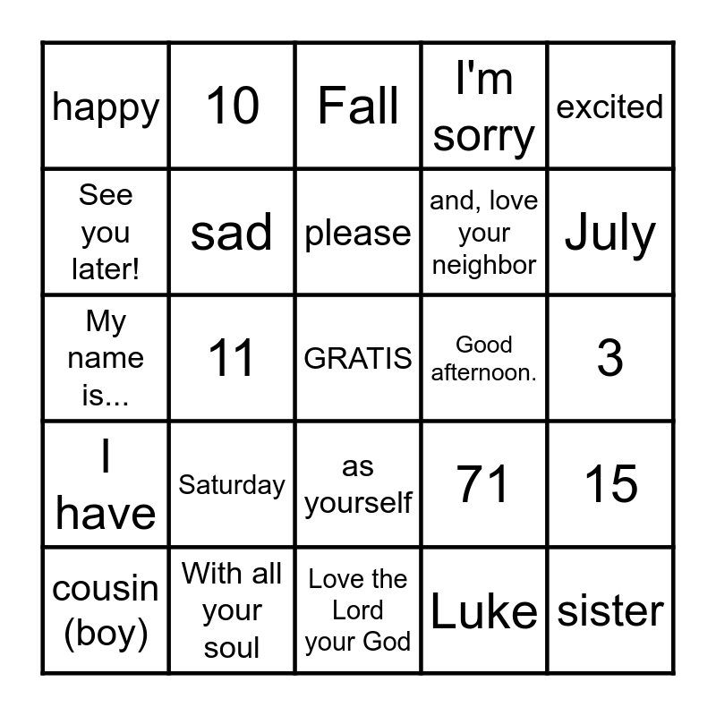 This bingo card has a free space and 149 words: 100, 98, 90, 89, 80, 71, 70, 67, 60, 56, 50, 43, 40, 35, 30, 27, 20, 19, 18, 17, 16, 15, 14, 13, 12, 11, 10, 9, 8, 7, 6, 5, 4, 3, yourself (3 words), 2, 1, all, and, love your neighbor, angry, April, as, as yourself, August, aunt, backpack, bless you, blue, brother, brown, cat, chair, cousin (boy), cousin (girl), dad, December, desk, Do you have...?, dog, door, excited, Fall, family, February, Friday, God, Good afternoon., good bye, Good evening/ Good night, Good morning., grandfather, grandmother, green, happy, heart, Hello!, How are you?, I am..., I have, I'm cold., I'm hot., I'm hungry., I'm sorry, I'm thirsty., iPad, January, July, June, Lord, love, Love the Lord your God, Luke, ma'am, Mrs., March, Mayo, mind, miss, Miss, mom, Monday, my, My name is..., neighbor, Nice to meet you., no, not well, November, Octobre, ok, orange, paper, pencil, pink, please, purple, red, sad, Saturday, See you later!, September, sir, Mr., sister, soul, Spanish folder, Spring, strength, Summer, Sunday, teacher (female), teacher (male), thank you, the, Thursday, tired, Tuesday, uncle, Wednesday, well, What's your name?, window, Winter, with, With all your heart, with all your mind, With all your soul, with all your strength, yellow, yes, you're welcome and your.