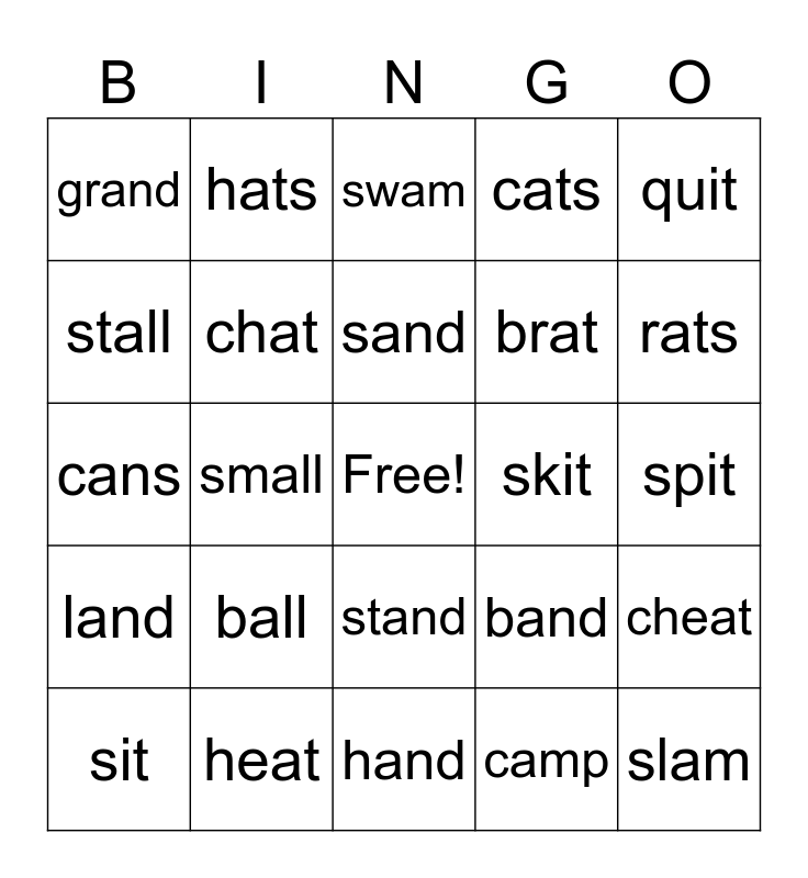 This bingo card has a free space and 24 words: ball, heat, sand, sit, quit, grand, stall, hats, skit, stand, brat, cans, band, cheat, chat, camp, spit, swam, rats, small, slam, land, cats and hand.