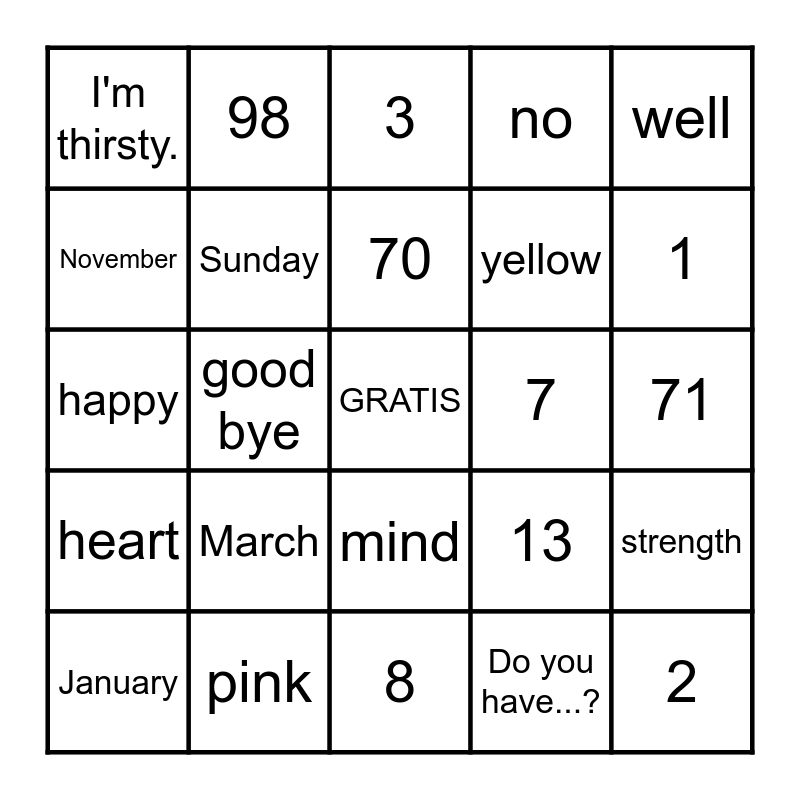 This bingo card has a free space and 168 words: 30, 40, 50, 60, 70, 80, 90, 100, 35, 43, 56, 67, 71, 89, 98, 45, 31, 59, 62, 73, 88, 94, all, neighbor, as, yourself (3 words), with all your strength, with all your mind, and, love your neighbor, as yourself, Luke, 27, January, February, March, April, May, June, July, August, September, October, November, December, Spring, Summer, Fall, Winter, yellow, blue, pink, orange, 12, 13, 14, 15, 16, 17, 18, 19, 20, Sunday, Monday, Tuesday, Wednesday, Thursday, Friday, Saturday, love, Lord, your, mind, strength, mom, dad, brother, sister, cousin (boy), cousin (girl), grandfather, grandmother, family, uncle, aunt, dog, cat, 1, 2, 3, 4, 5, 6, 7, 8, 9, 10, red, green, purple, brown, please, thank you, you're welcome, bless you, I'm sorry, Spanish folder, student (boy), student (girl), paper, pencil, teacher (male), teacher (female), iPad, my, I have, Do you have...?, yes, no, chair, desk, door, window, backpack, love, the, Lord, your, God, with, all, heart, soul, Love the Lord your God, With all your heart, With all your soul, How are you?, happy, angry, sad, tired, excited, I'm hungry., I'm thirsty., I'm cold., I'm hot., well, not well, ok, very, I am, very well, I am very happy., I am very excited., Hello!, Good morning., Good afternoon., Good evening/ Good night, your name?, My name is..., I am..., Nice to meet you., sir, Mr., ma'am, Mrs., miss, Miss, friend (boy), friend (girl), good bye and See you later!.