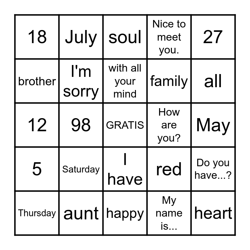 This bingo card has a free space and 168 words: all, neighbor, as, with all your strength, with all your mind, and, love your neighbor, as yourself, Luke, January, February, March, April, May, June, July, August, September, October, November, December, Spring, Summer, Fall, Winter, yellow, blue, pink, orange, Sunday, Monday, Tuesday, Wednesday, Thursday, Friday, Saturday, love, Lord, your, mind, strength, mom, dad, brother, sister, cousin (boy), cousin (girl), grandfather, grandmother, family, uncle, aunt, dog, cat, red, green, purple, brown, please, thank you, you're welcome, bless you, I'm sorry, Spanish folder, student (boy), student (girl), paper, pencil, teacher (male), teacher (female), iPad, my, I have, Do you have...?, yes, no, chair, desk, door, window, backpack, love, the, Lord, your, God, with, all, heart, soul, Love the Lord your God, With all your heart, With all your soul, How are you?, happy, angry, sad, tired, excited, I'm hungry., I'm thirsty., I'm cold., I'm hot., well, not well, ok, very, I am, very well, I am very happy., I am very excited., Hello!, Good morning., Good afternoon., Good evening/ Good night, your name?, My name is..., I am..., Nice to meet you., sir, Mr., ma'am, Mrs., miss, Miss, friend (boy), friend (girl), good bye, See you later!, 1, 2, yourself (3 words), 3, 4, 5, 6, 7, 8, 9, 10, 12, 13, 14, 15, 16, 17, 18, 19, 20, 27, 30, 31, 35, 40, 43, 45, 50, 56, 59, 60, 62, 67, 70, 71, 73, 80, 88, 89, 90, 94, 98 and 100.