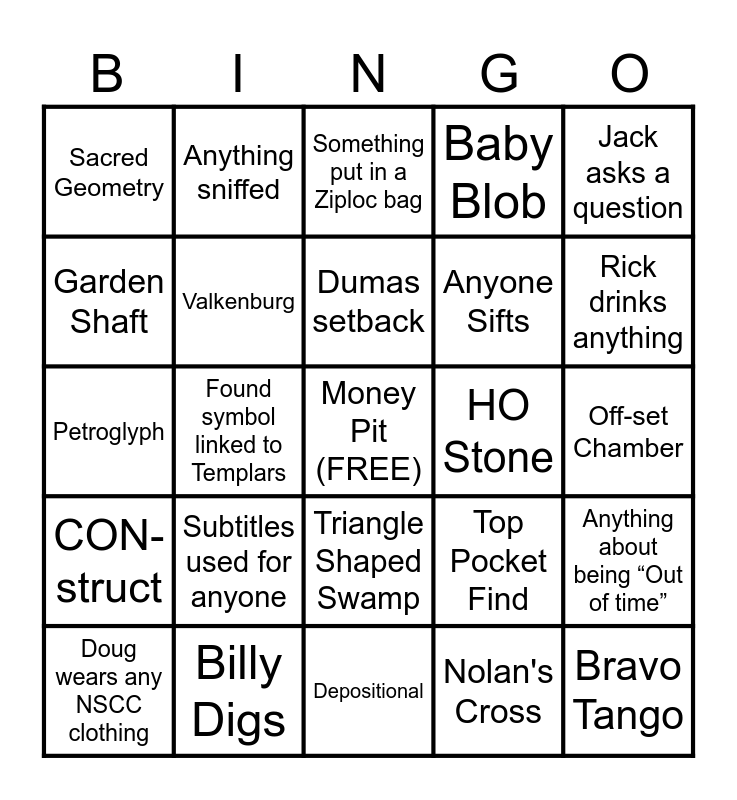 This bingo card has a free space and 24 words: Subtitles used for anyone, Billy Digs, Dumas setback, Doug wears any NSCC clothing, Jack asks a question, Sacred Geometry, Garden Shaft, Anything sniffed, HO Stone, Triangle Shaped Swamp, Anyone Sifts, Petroglyph, Top Pocket Find, Anything about being “Out of time”, Valkenburg, Nolan's Cross, Off-set Chamber, Something put in a Ziploc bag, Rick drinks anything, Found symbol linked to Templars, Bravo Tango, CON-struct, Baby Blob and Depositional.