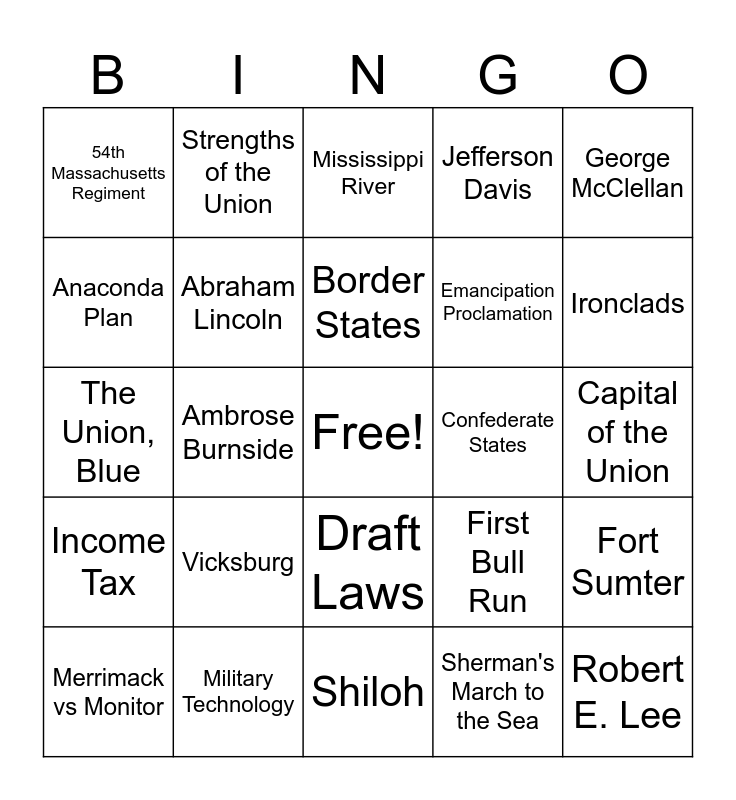 This bingo card has a free space and 47 words: Gettysburg, Robert E. Lee, Ulysses S. Grant, Shiloh, Vicksburg, Antietam, Strengths of the Union, Strengths of the Confederate, Anaconda Plan, Strategies of the Confederacy, Abraham Lincoln, Jefferson Davis, Fort Sumter, First Bull Run, American Red Cross, Free Union States, Border States, Confederate States, Stonewall Jackson, George McClellan, Ambrose Burnside, Sherman's March to the Sea, 54th Massachusetts Regiment, Emancipation Proclamation, Gettysburg Address, Ironclads, Merrimack vs Monitor, Photography, Draft Laws, Income Tax, Inflation, Siege, George Pickett, Total War, Surrender at Appomattox Courthouse, Military Technology, Capital of the Union, Capital of the Confederacy, South Carolina, Emancipation, George C. Meade, Mississippi River, The Union, Blue, Gray, 11, 23,000 and Virginia, Tennessee, North Carolina, Arkansas and West Virginia.