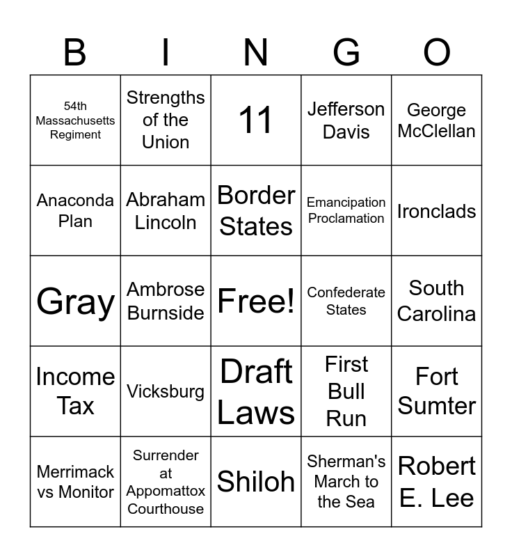 This bingo card has a free space and 49 words: Gettysburg, Robert E. Lee, Ulysses S. Grant, Shiloh, Vicksburg, Antietam, Strengths of the Union, Strengths of the Confederate, Anaconda Plan, Strategies of the Confederacy, Abraham Lincoln, Jefferson Davis, Fort Sumter, First Bull Run, American Red Cross, Free Union States, Border States, Confederate States, Stonewall Jackson, George McClellan, Ambrose Burnside, Sherman's March to the Sea, 54th Massachusetts Regiment, Emancipation Proclamation, Gettysburg Address, Ironclads, Merrimack vs Monitor, Photography, Draft Laws, Income Tax, Inflation, Siege, George Pickett, Total War, Surrender at Appomattox Courthouse, Military Technology, Capital of the Union, Capital of the Confederacy, South Carolina, Emancipation, George C. Meade, Mississippi River, The Union, Blue, Gray, 11, 23,000, Virginia, Tennessee, North Carolina, Arkansas and West Virginia.