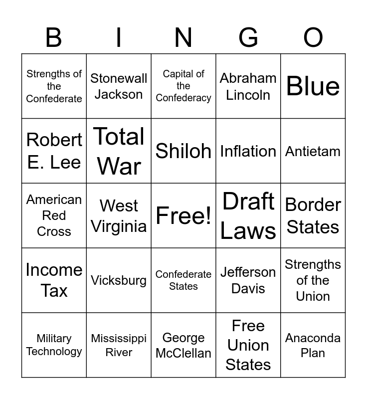 This bingo card has a free space and 49 words: South Carolina, Anaconda Plan, Virginia, Tennessee, North Carolina, Arkansas, George McClellan, Vicksburg, Photography, Stonewall Jackson, 23,000, Robert E. Lee, 11, Total War, Abraham Lincoln, Strengths of the Union, Jefferson Davis, Fort Sumter, George C. Meade, Shiloh, Draft Laws, Ulysses S. Grant, Blue, West Virginia, Free Union States, Strengths of the Confederate, Inflation, Capital of the Union, Antietam, Military Technology, George Pickett, Confederate States, Income Tax, Gray, Siege, Ironclads, Merrimack vs Monitor, Mississippi River, Ambrose Burnside, Emancipation, Sherman's March to the Sea, Border States, Strategies of the Confederacy, Gettysburg Address, Gettysburg, Surrender at Appomattox Courthouse, The Union, American Red Cross, Capital of the Confederacy, First Bull Run, Emancipation Proclamation and 54th Massachusetts Regiment.