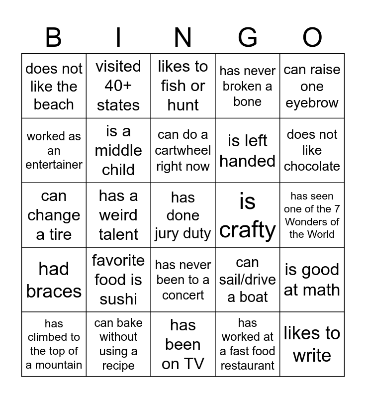 This bingo card has a free space and 49 words: is allergic to cats or dogs, likes to write, has never died their hair, has been on TV, favorite food is sushi, has eaten french fries in the last 24 hours, visited 40+ states, has never gotten a speeding ticket, worked as an entertainer, is fluently bilingual, is a middle child, has never broken a bone, is good at math, can sail/drive a boat, visited 5+ countries, has painted toenails, can do a cartwheel right now, is crafty, was in high school band, can raise one eyebrow, has a weird talent, has worked at a fast food restaurant, does not like the beach, is left handed, attended a professional league sports game, does not like chocolate, has climbed to the top of a mountain, has driven through Canada more than once, has never been to a concert, had braces, likes tea more than coffee, has visited a Disney theme park, has eaten escargot, likes pineapple on their pizza, can bake without using a recipe, loves to eat cheese, does not have social media, has been skydiving or ziplining, has seen one of the 7 Wonders of the World, rescues items from thrift stores, has French ancestors, prefers Pepsi over Coke, kills houseplants, is a "neat freak", can change a tire, likes to fish or hunt, has had stitches, has blue eyes and shops at Safeway.